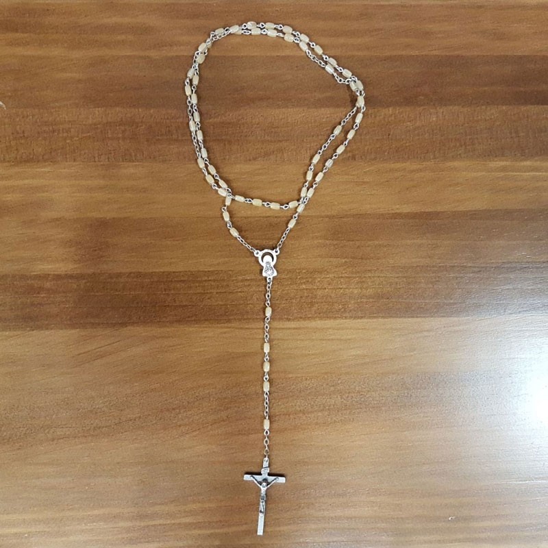 Rosario color agata con cuentras de piedra y cruz y adornos de metal plateado.